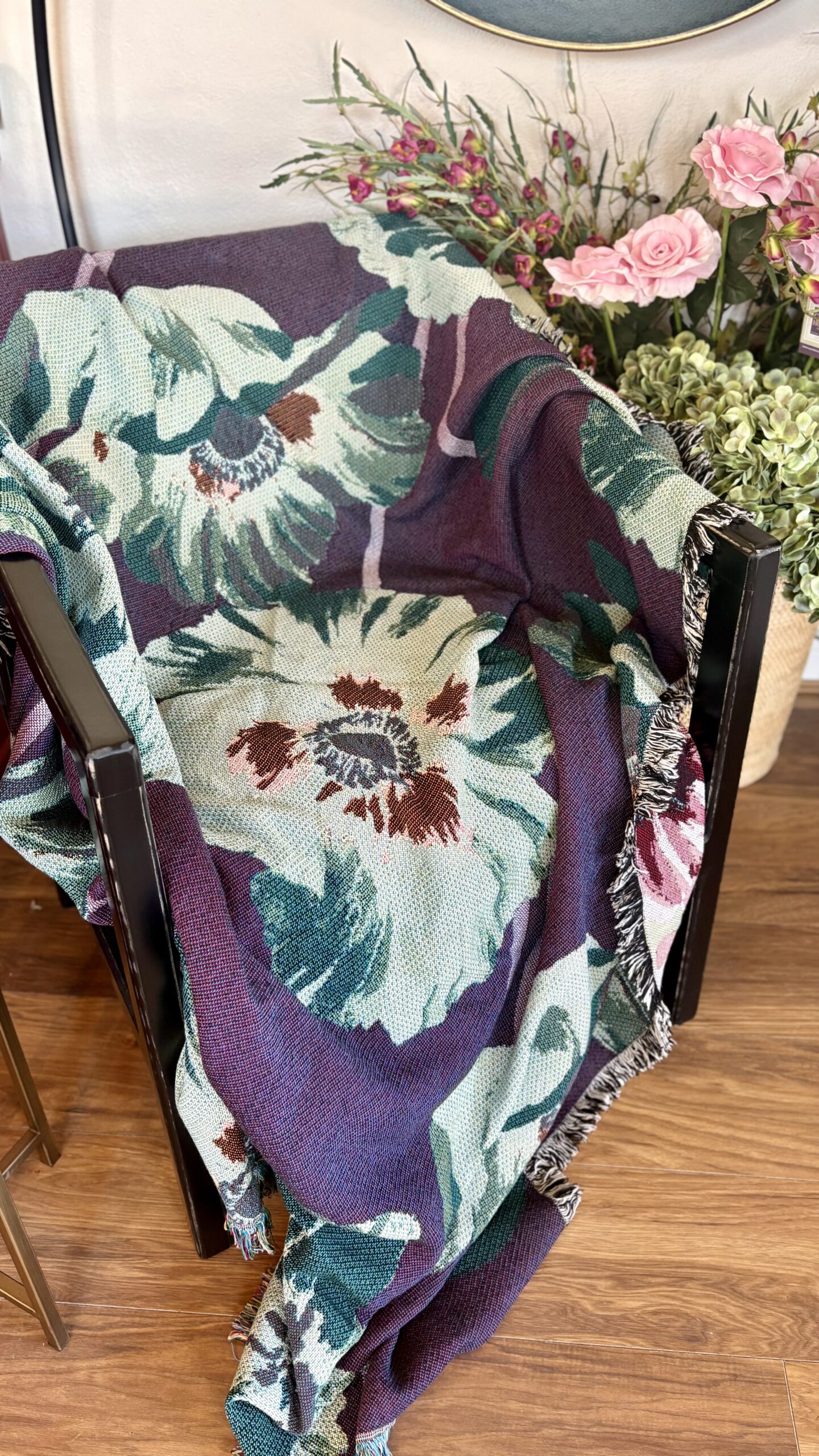 Large poppies and foliage give a nostalgic feel to this super soft, woven blanket. Art is to be enjoyed and be both beautiful and functional. You can hang this blanket on the wall, wear it as a shawl, drape it across your couch, bed or cuddle up in it. Snuggly but weighty, with soft fringe edging. Perfect for shoulders on a summer’s eve, by the fire on a cool evening, keeping covered in bed, or making a picnic a show stopping event! To be kept or gifted as an heirloom for generations to come.