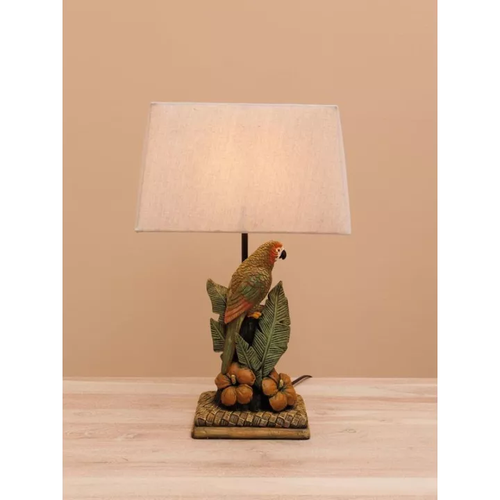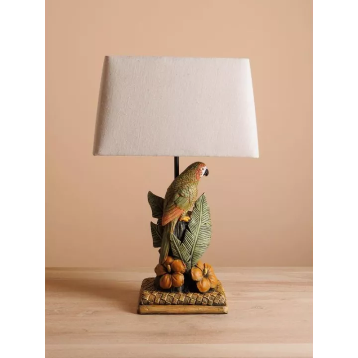 This stylish & quirky parrot lamp will bring light & fun to any room. With it’s tropical style, the cream linen shade, green resin leaves & orange blossoms all add to the pop of colour this piece offers.