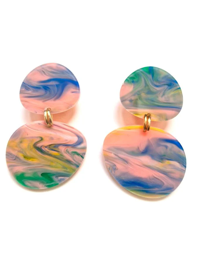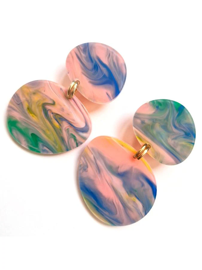 eve ray ‘woman star’ drop earrings in new pink/blue pastel acrylic like the pink skies of summer. Inspired by Joan Miro’s painting Woman, Bird and Star. Each earring is different due to the marble like patterns of this stunning recycled perspex.