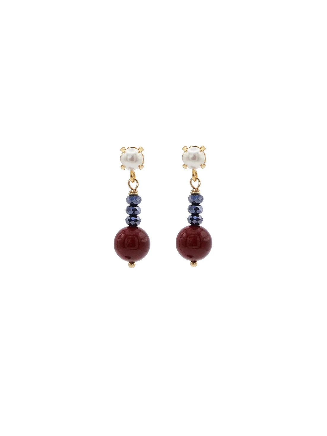 The Clair Earrings blend classic beauty with modern edge — a delicate balance of deep burgundy shell pearls, faceted black crystals, and luminous white pearls.